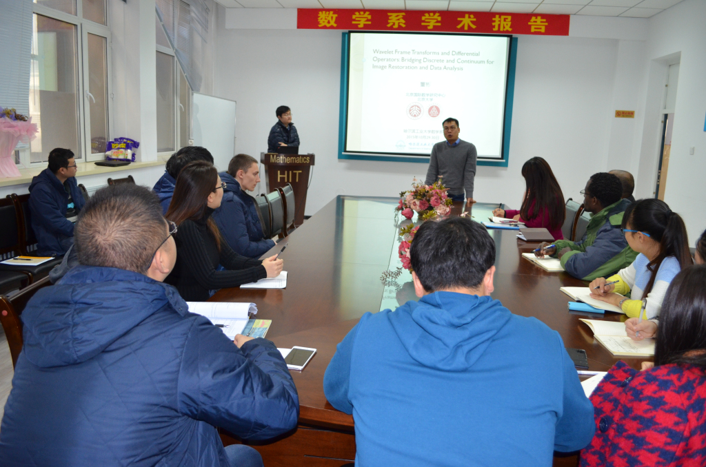 2015年10月30日 上午9:00,北京大学董彬教授在数学系会议室(格物楼503)作了题为《Wavelet Frame Transforms and Differential Operators:Bridging Discrete and Continuum for Image Restoration and Data Analysis》的学术报告,报告由马坚伟教授主持,数学系十余位师生听取了报告并进行了热烈的讨论。