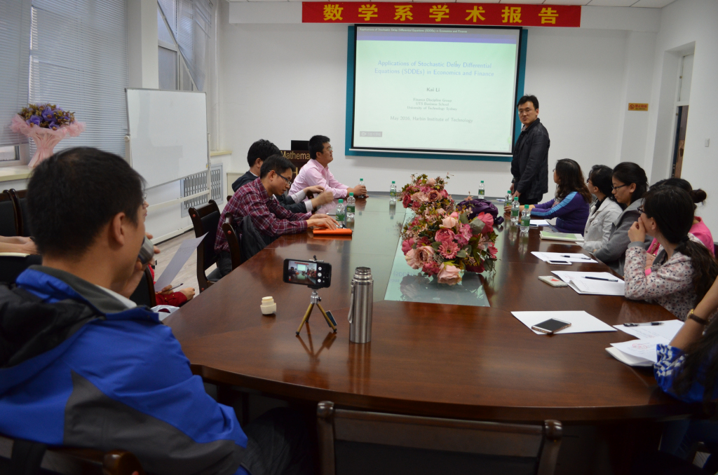 2016年5月17日下午3:00-5:00,悉尼科技大学商学院李凯博士在数学系会议室(格物楼503)做了题为《Applications of Stochastic Delay Differential Equations (SDDEs) in Economics and Finance》的学术报告,报告由王春程副教授主持,数学系40余位师生听取了报告,并进行了热烈的讨论。